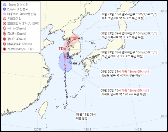 변수는 태풍이다. 기상청에 따르면 오후 5시 기준, 태풍 종다리는 제주 서귀포 서쪽 약 100km 해상에서 시속 33km의 속도로 북진 중이다. 이번 태풍 종다리는 중심기압 1000hPa, 최대 풍속 65km/h(18m/s)의 소형 태풍이다.