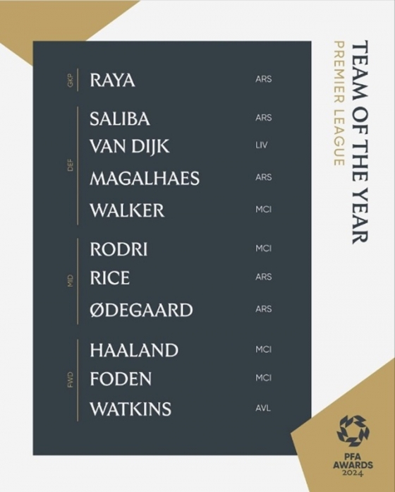 또 올해의 팀도 발표됐다. 그런데 축구팬들이 분노를 나타냈다. 최고의 활약을 보여준 팔머가 빠졌기 때문이다. 올해의 팀은 아스널 선수 외데고를 비롯해, 데클란 라이스, 윌리엄 살리바, 다비드 라야가 포함됐다. 맨시티는 4명으로 포든과 함께 홀란, 로드리, 카일 워커가 들어갔다. 나머지 두 자리는 애스턴빌라 공격수 왓킨스, 리버풀 센터백 버질 반 다이크가 차지했다.