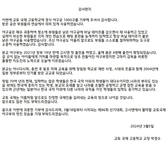 2021년 처음 고시엔에 출전한 교토국제고에 있어 올해 봄이 4번째였다. 박경수 교장은 "귀중한 기부에 감사드리며, 3월 18일부터 시작되는 제96회 선기대회, 고시엔에서 활약할 교토국제야구부의 멋진 모습을 기대 부탁드리겠습니다"라고 끝맺었다.