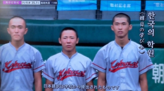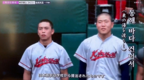 그런데 교가 중 '동해 바다 건너서'라는 가사에서 고유어인 '동해'가 일본어인 '동쪽 바다(東の海)'라고 번역된 것이다. 또 '한국의 학원'이라는 가사 역시 '한국(韓國)'이 아닌 '한일(韓日)'로 번역돼 중계화면에 나갔다. 자칫 일본 내에서 민감하게 반응할 수 있는 부분들만 바꿨다는 지적이 나왔다.