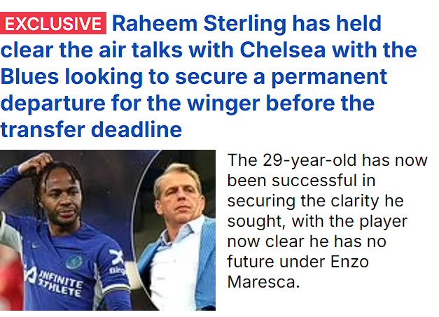 스털링은 2024~2025시즌 프리미어리그 1라운드 맨체스터 시티와 경기에서 명단 제외됐다. 선수 대리인은 경기 불과 한 시간 전 성명서를 통해 "스털링은 첼시에서 제대로 대우를 받지 못하고 있다"고 분통을 터트렸다. 영국 '기브미스포츠' 등에 따르면 첼시 수뇌부는 스털링의 항명에 분노했다. 사실상 전력 외 취급 중이다.