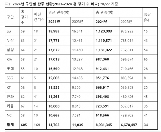 롯데는 1만 6590명, SSG는 1만 5603명으로 평균 1만 5000명을 넘기고 있고, KT 1만 1533명, 한화 1만 1265명, 키움 1만 800명, NC 1만 665명으로 모든 구단이 평균 1만 명 이상을 유지하고 있다.