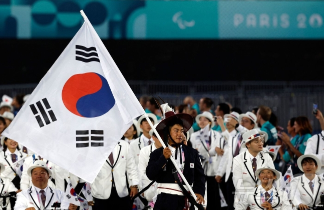 이날 개회식은 대회 심볼 '아지토스'가 걸린 프랑스 파리 개선문에서 출발해 샹젤리제 거리와 콩코르드 광장까지 행진하면서 진행됐다. 양팔과 다리 절단 장애가 있는 수영 선수 테오 퀴랭의 영상으로 시작해 장애인 예술가와 댄서, 가수들의 공연이 이어진 뒤 각국 선수단이 입장했다. 한국 선수단은 주립(붉은 갓)을 쓴 카누 선수 최용범(27·도원이엔씨)이 기수로 나선 가운데 36번째로 등장했다.