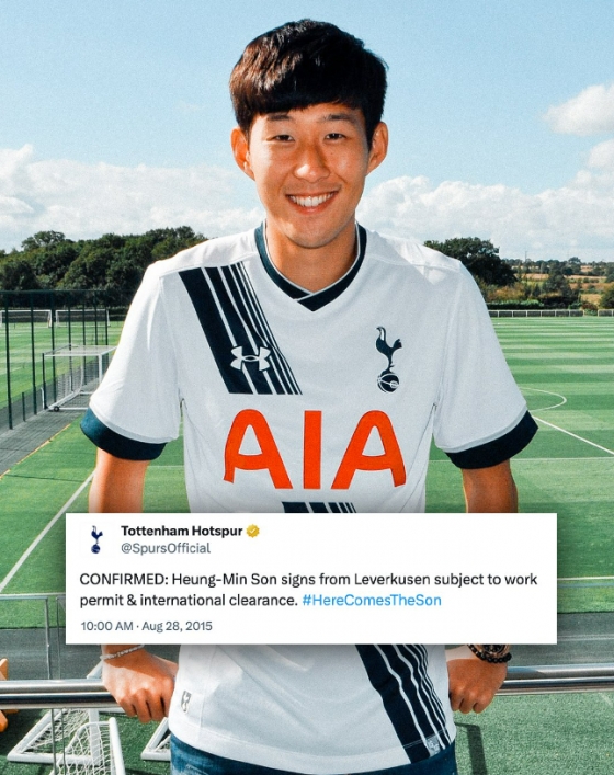손흥민은 2015년 8월 독일 분데스리가의 바이어 레버쿠젠을 떠나 토트넘 유니폼을 입었다. 현 주장의 입단 당시를 추억한 토트넘은 손흥민이 9년 전에 구단 건물 앞에서 찍은 사진을 게시하기도 했다.