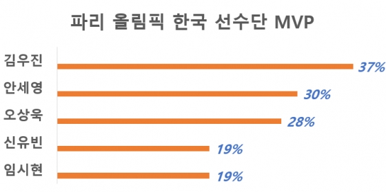 2024 파리 올림픽에서 한국 선수단 MVP(최우수선수)로 양궁 3관왕 김우진(32·청주시청)이 첫 손에 꼽혔다. 펜싱 2관왕 오상욱(28·대전광역시청)은 30~40대 여성들에게서 가장 많은 지지를 받았다.