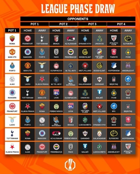 유럽축구연맹(UEFA)는 30일(한국시간) 모나코의 그리말디 포럼에서 2024~2025 UEL 리그 페이즈 대진 추첨을 진행했다. 그 결과 토트넘은 AS로마(이탈리아)와 레인저스(스코틀랜드·이상 1포트), 알크마르(네덜란드), 페렌츠바로시(헝가리·이상 2포트), 카라바흐(아제르바이젠), 갈라타사라이(튀르키예·이상 3포트), 엘프스보리(스웨덴), 호펜하임(독일·이상 4포트)과 맞붙게 됐다.