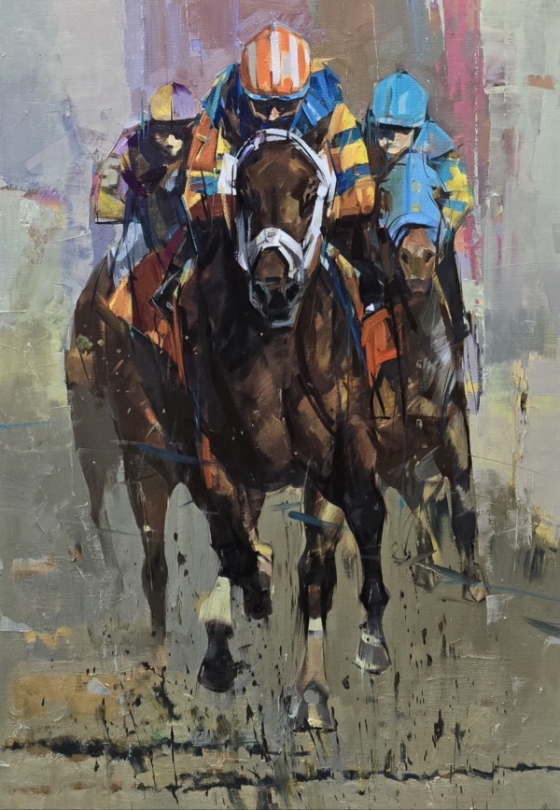 붓과 나이프가 빠르게 오간 화면은 관람객들에게 가까이서 경주를 보는 듯한 기분 좋은 긴장감을 고조시키고, 육중한 마체와 경쾌한 복색의 기수들이 자아내는 대비는 화려한 피아노의 변주곡을 연상시킨다.