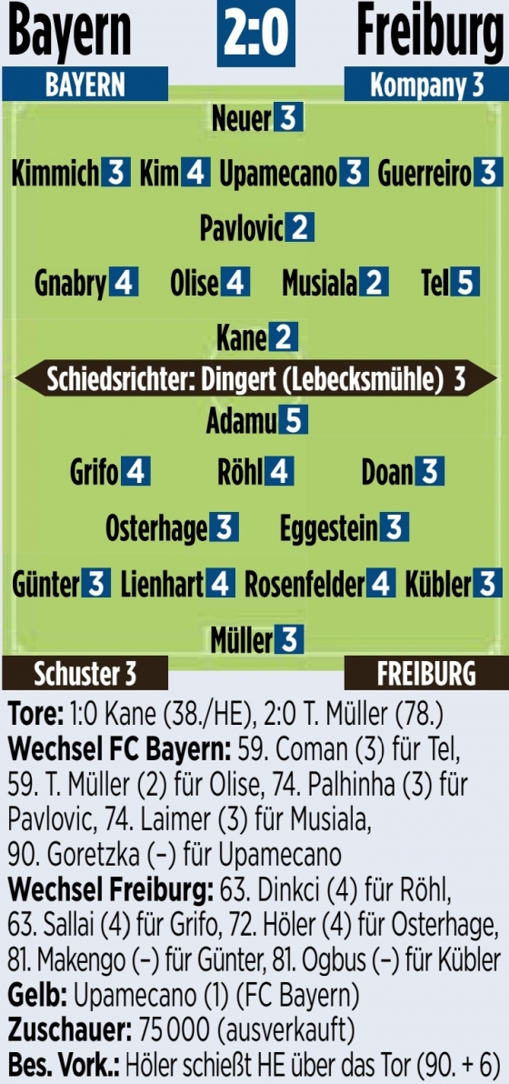 프라이부르크전에서 콤파니 감독은 3-2-4-1 포메이션을 썼다. 케인이 최전방에 서고 마티스 텔, 자말 무시알라, 마이클 올리세, 그나브리가 2선에 포진했다. 중앙 미드필더로는 알렉산다르 파블로비치와 요슈아 키미히가 나섰다. 스리백에 하파엘 게헤이루, 김민재, 우파메카노가 나왔다. 골문은 마누엘 노이어가 지켰다.