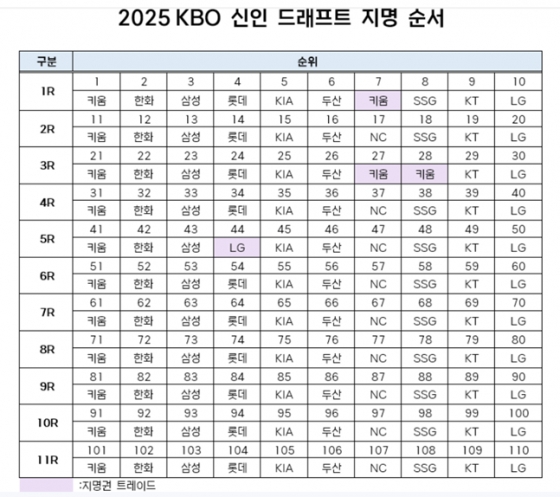 키움은 올해 1월 12일 이지영을 SSG로 보내면서 2025 신인 3라운드 지명권을 받았고, 5월 30일에는 NC와 트레이드를 통해 김휘집과 1, 3라운드 지명권을 맞바꿨다. LG는 지난 해 11월 27일 롯데에 진해수를 내주고 5라운드 지명권을 얻었다.