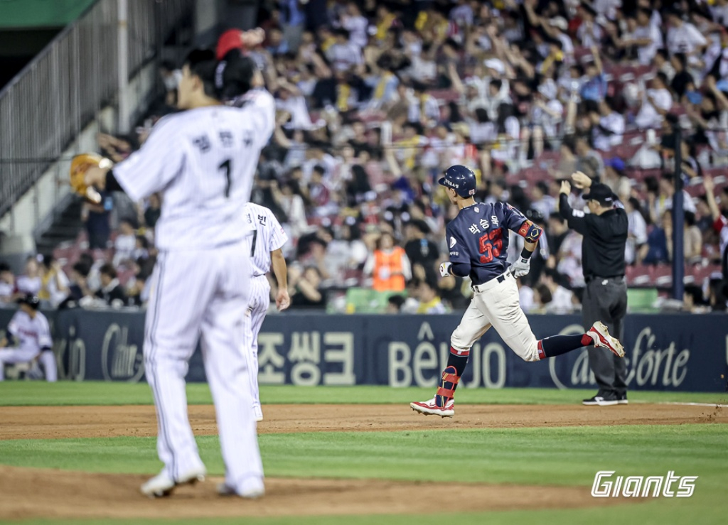 롯데는 3회 선취점을 허용하며 끌려갔으나, 5회 큰 것 한 방으로 승부를 1-1 원점으로 돌렸다. 선두타자 정훈이 유격수 땅볼로 물러난 가운데, 1사 주자 없는 상황. 박승욱이 볼카운트 1-1에서 임찬규의 3구째 슬라이더(132.6km)를 공략, 우측 담장을 넘어가는 동점 솔로 아치를 그렸다. 박승욱의 올 시즌 6호 홈런. 발사각은 30도, 타구 속도는 162.1km, 비거리는 123m였다.