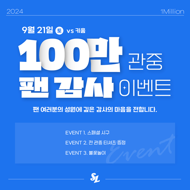 삼성 라이온즈는 창단 최초 홈 입장 관중 100만명 돌파 기념으로 팬 감사 이벤트를 준비했다고 11일 밝혔다.
