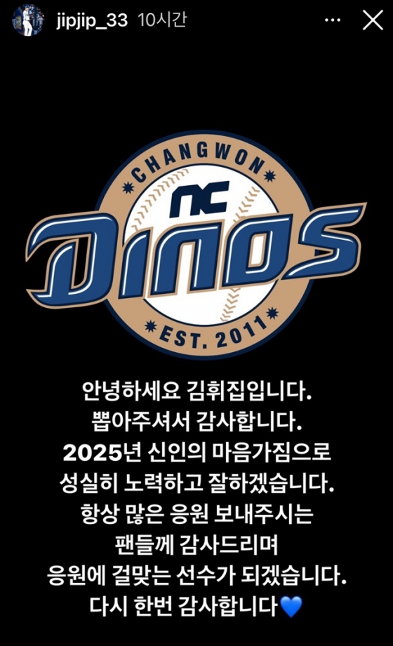 선수 본인도 이런 시선을 아는 듯했다. 김휘집은 11일 자신의 SNS에 "안녕하세요 김휘집입니다. 뽑아주셔서 감사합니다"로 시작하는 게시물을 남겼다. 신인 선수들이 지명 후 뽑아준 구단에 인사하는 글을 패러디한 것이었다. 그는 "2025년 신인의 마음가짐으로 성실히 노력하고 잘하겠다"며 각오를 전했다.
