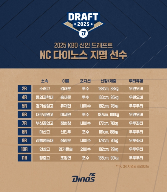 NC는 11일 오후 2시 서울 롯데호텔 월드 크리스탈 볼룸에서 열린 2025 KBO 신인 드래프트에서 2라운드에서 소래고 투수 김태훈, 4라운드에서 동의과학대 투수 홍재문을 선발하는 등 11라운드까지 총 9명의 선수를 지명했다.