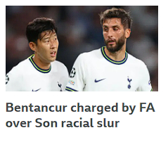 영국 'BBC'는 12일(한국시간) "토트넘 미드필더 벤탄쿠르는 팀 동료 손흥민을 인종차별한 혐의로 FA에 기소됐다"고 보도했다.