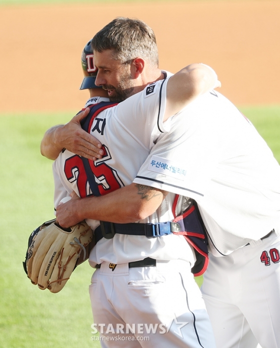 시구자로 나선 니퍼트는 함께 호흡을 맞췄던 포수 양의지와 뜨거운 포옹을 나누고 파이팅을 외쳤다. 남다른 애정을 나타냈던 둘이기에 더욱 팬들의 커다란 환호를 자아낸 장면이었다.