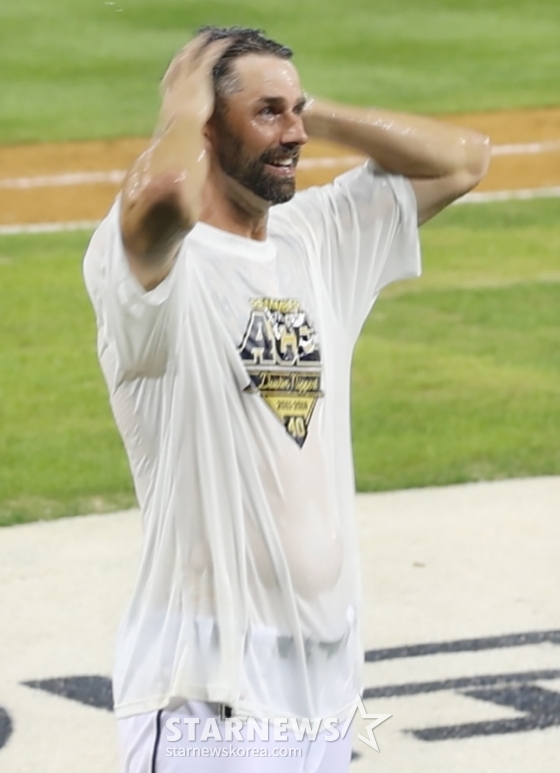 니퍼트가 은퇴식 후 동료들이 뿌린 물세례 축하를 받고 활짝 웃고 있다.