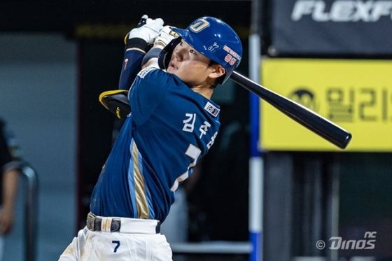 3회에는 스트레이트 볼넷으로 출루했던 김주원은 3번째 타석에서는 해결사가 됐다. 2-0으로 앞서던 NC는 5회 말 박민우의 안타로 1사 1루를 만들었다. 여기서 김주원이 변화구를 밀어쳐 우익선상 옆으로 날아가는 2루타를 만들었고, 박민우가 홈으로 들어오며 3-0으로 도망갔다. 이어 4번 김휘집의 적시타 때 김주원 본인도 득점에 성공했다.
