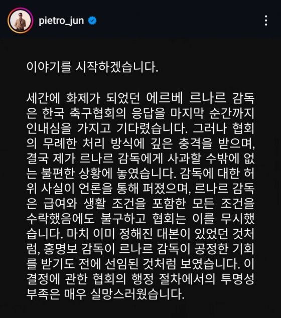 전 대표이사는 19일 개인 사회관계망서비스(SNS)에 본인을 JP스포츠그룹 대표팀을 소개하며 "에르베 르나르 감독은 축구협회의 응답을 마지막 순간까지 인내심을 갖고 기다렸다. 하지만 협회의 무례한 처리 방식에 깊은 충격을 받았다. 제가 대신 사과할 수밖에 없었다"고 밝혔다.
