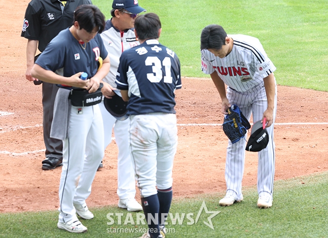 스포츠야구[포토] 정수빈 '아프냐? 나도 아프다'발행 : 2024.09.21 ・ 15:39잠실=김진경 대기자'2024 신한 SOL 뱅크 KBO리그' LG-두산전이 21일 서울 잠실야구장에서 더블헤더로 열렸다.DH 1차전4회초 무사에서 두산 정수빈이 LG 임준형의 몸쪽 공에 맞고 고통스러워하자 임준형이 교체되며 사과하고 있다.<저작권자 © 스타뉴스, 무단전재 및 재배포 금지>LG두산에르난데스곽빈김동욱윤박추천 기사김진경 대기자기자홈좋아요 스포츠-야구의 인기 급상승 뉴스스포츠-야구의 최신 뉴스