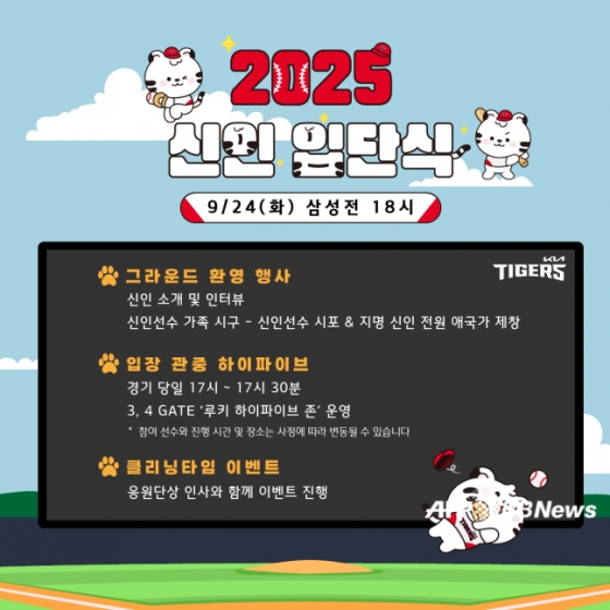 KIA 구단은 "24일 오후 3시 광주-기아 챔피언스 필드에서 2025년 신인 선수 입단식을 개최한다"고 23일 밝혔다.
