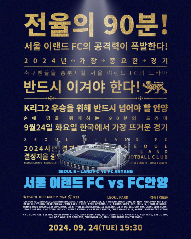 서울 이랜드는 23일 "K리그2 우승과 다이렉트 승격을 위해 반드시 넘어야 하는 안양이다. 올 시즌 서울 이랜드에 2패를 안긴 안양을 상대로 복수전을 펼치겠다는 선수단의 각오가 결연하다"고 전했다. 홈 경기 포스터에서도 "2024년 가장 중요한 경기, 반드시 이겨야 한다!"고 강조했다.