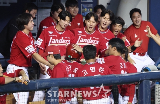 SSG 1회초 1사 1,2루에서 에레디아의 선제 1타점 적시타 때 선제 득점한 최지훈이 더그아웃에서 동료들의 환영을 받고 있다.