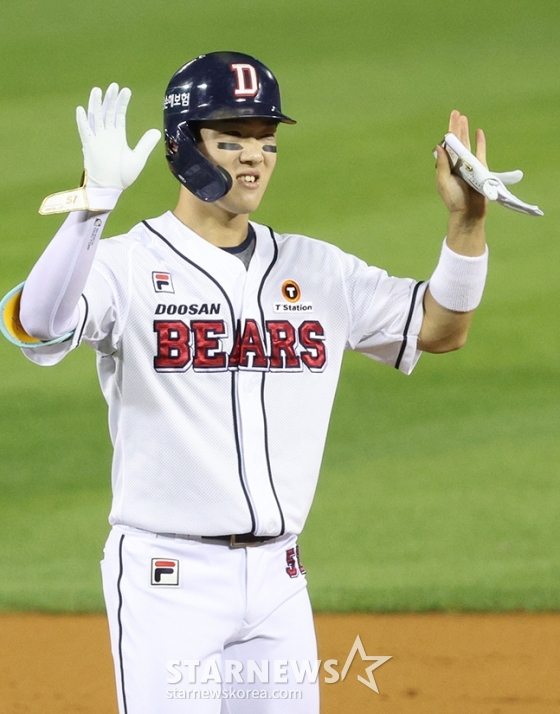두산 조수행이 2회말 1사 1,2루에서 1타점 적시 2루타를 날리고 출루한 후 김동한 코치의 환영을 받고 있다.