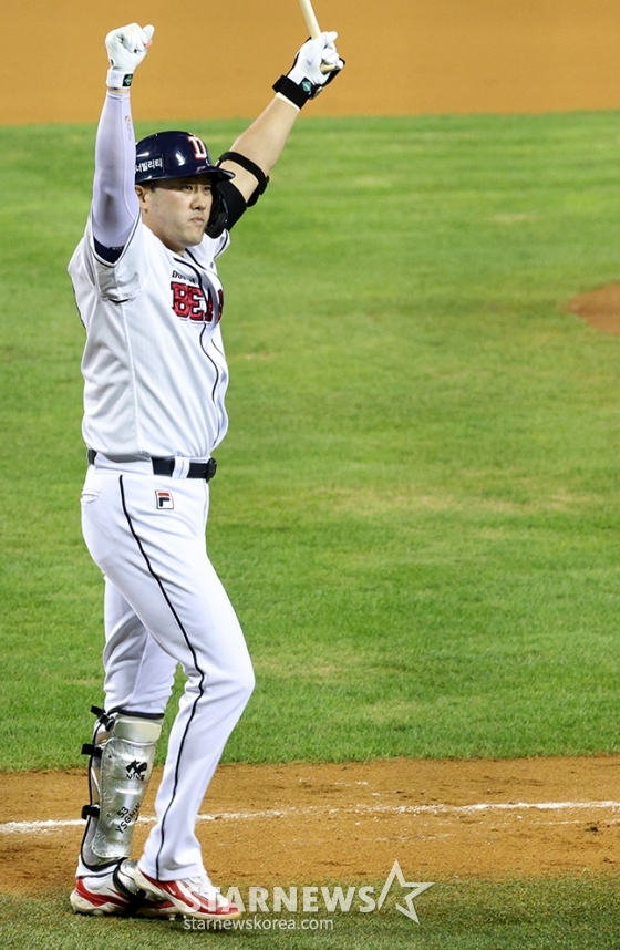 두산 양석환이 7회말 무사에서 좌월 1점 홈런을 날린 후 두 팔을 뻔쩍든 채 1루로 향하고 있다.