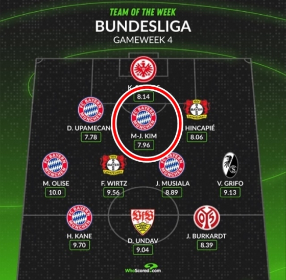 이와 달리 후스코어드닷컴은 김민재를 4라운드 최고의 선수 중 한 명으로 치켜세웠다. 김민재와 함께 뮌헨 동료 다요 우파메카노, 레버쿠젠 센터백 피에로 잉카피가 이주의 팀에 뽑혔다. 우파메카노는 평점 7.78, 잉카피에는 평점 8.06을 기록했다. 뮌헨 선수는 무려 5명이나 들어갔다. 브레멘전 2골 2도움을 올린 마이클 올리세(10.0)을 비롯해 자말 무시알라(평점 8.09), 해리 케인(평점 9.70)이 주인공이었다.