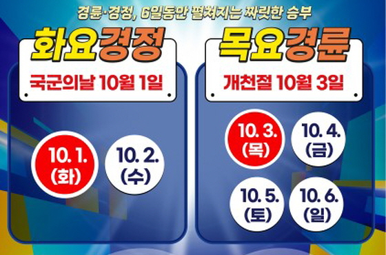 10월 첫 주, 6일 동안 열리는 경륜은 11~13일 사흘간 언론사(일간스포츠)배 대상 경륜이 열리고, 경정은 한국 경정의 아버지라 불리는 쿠리하라 코이치로의 공로를 기리는 '쿠리하라 특별경정'이 16(수)~17(목) 양일간 열릴 예정이다.
