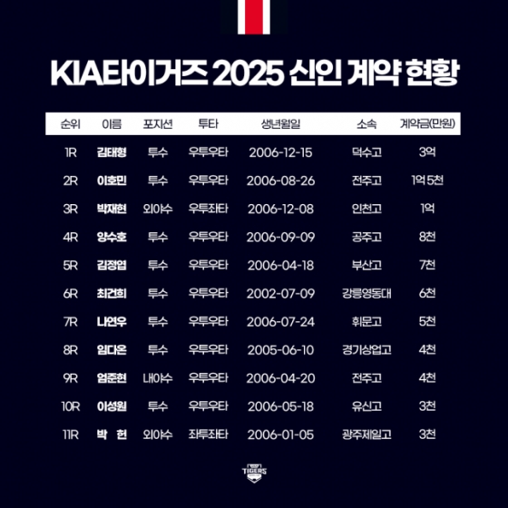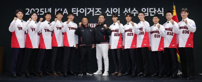 KIA 타이거즈가 2025년도 신인 선수 11명과 입단 계약을 마무리했다. 이범호(43) 감독 및 1군 선수단 그리고 홈팬들을 마주한 아기 호랑이들은 당찬 포부와 함께 프로로서 첫발을 내디뎠다.