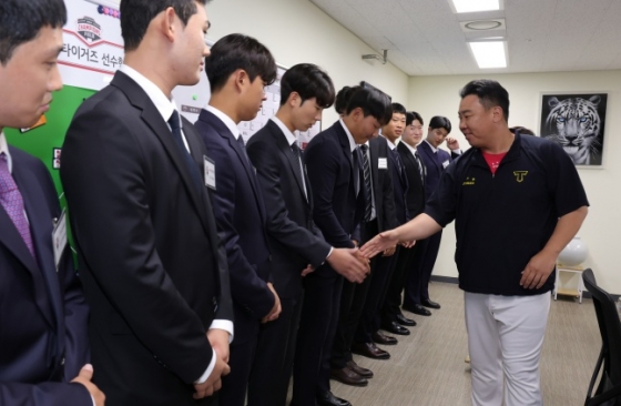 KIA는 24일 광주-기아챔피언스필드에서 펼쳐질 삼성 라이온즈와 2024 신한 SOL 뱅크 KBO 리그 정규시즌 팀 간 최종전을 앞두고 신인 선수 입단식을 진행했다.