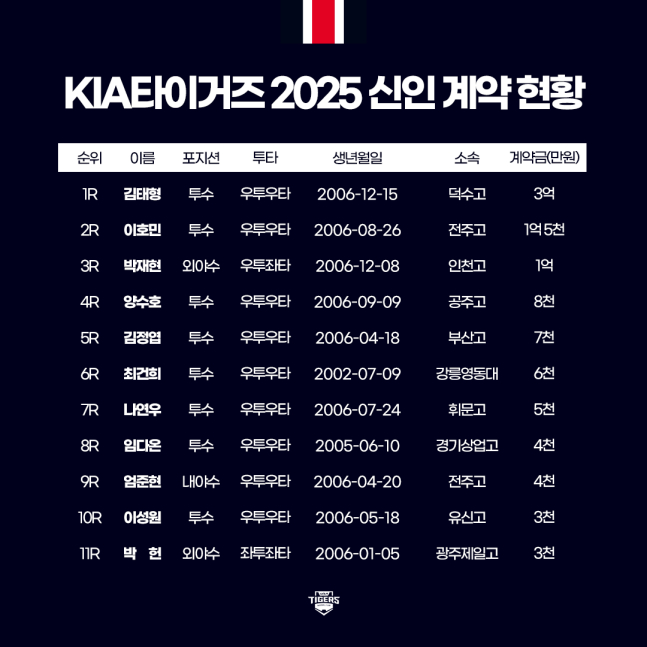 김태형과 가장 높은 금액인 계약금 3억 원에 입단 계약을 체결했다. 뒤이어 2라운드 이호민과 계약금 1억 5000만 원, 3라운드 박재현과 계약금 1억 원 등 2025년 신인 선수 11명과 계약을 완료했다. 신인 선수 연봉은 3000만 원으로 모두 동일하다.