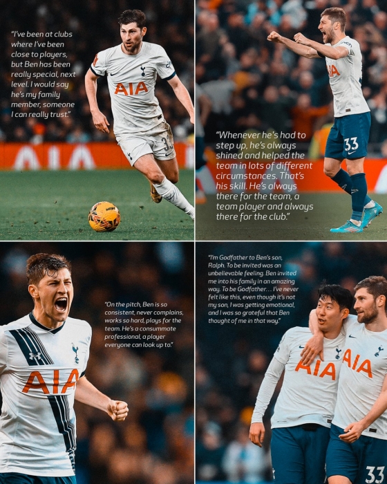 이어 손흥민은 "토트넘에서 많은 선수와 친했지만, 특히 벤은 정말 특별하다. 내 가족이다. 정말로 신뢰할 수 있는 사람이라고 표현하겠다. 어려움을 겪거나 조언이 필요하면 항상 물어볼 것이다"며 애정을 드러냈다.
