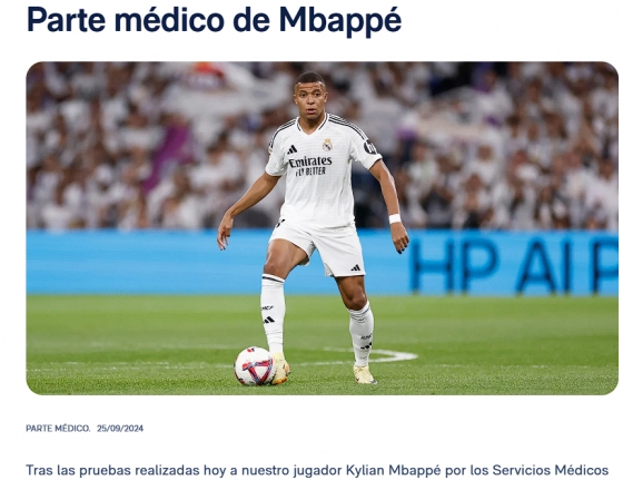 레알 마드리드는 25일(한국시간) 구단 공식 홈페이지를 통해 "음바페의 몸 상태를 알린다"며 "구단 의료진은 음바페에 대한 검사를 실시했다. 그는 왼쪽 다리 대퇴 이두근(햄스트링) 부상이라는 진단을 받았다"고 발표했다.