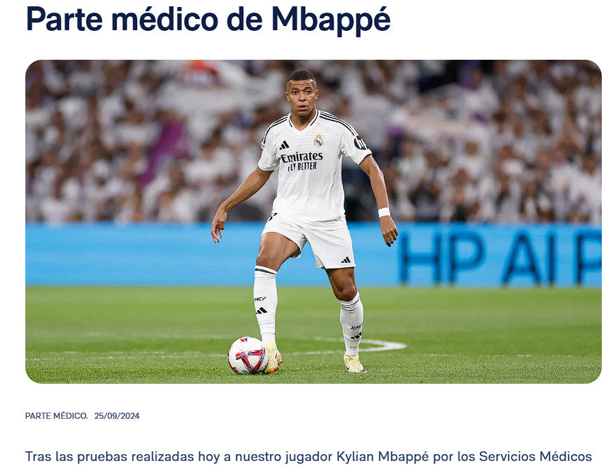 음바페는 지난 25일 데포르티보 알라베스와 2024~2025시즌 스페인 라리가 7라운드 경기에 선발 출전했다. 후반 35분까지 뛴 뒤 음바페는 교체됐다. 스페인 현지 매체의 보도에 따르면 음바페는 다소 불편한 표정으로 경기장을 빠져나갔다.