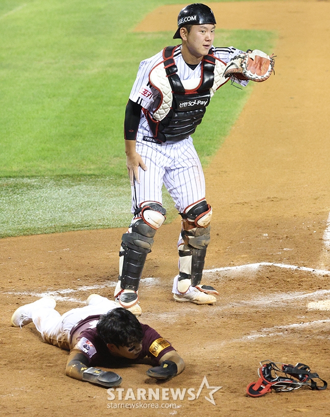 키움 7회초 2사 1루에서 1루주자 박수종이 송성문의 2루타 때 홈으로 뛰어들다 LG 포수 이주헌에 태그아웃되고 있다.