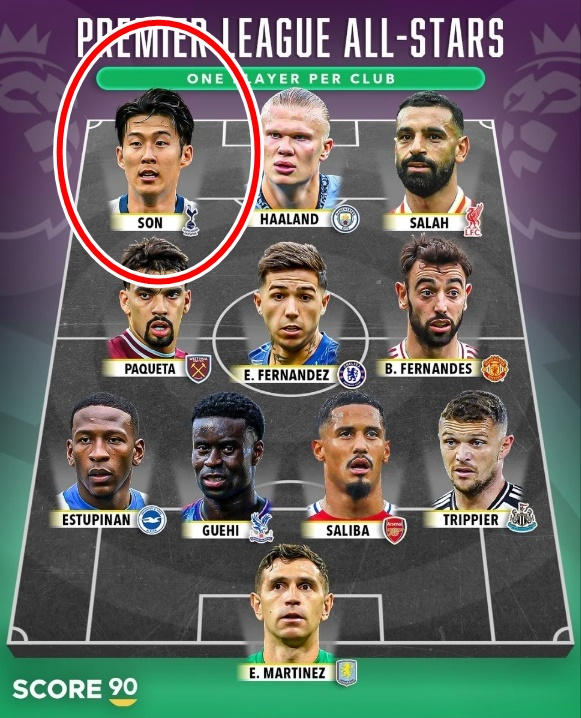 축구전문 스코어90은 지난 25일(한국시간) EPL 정상급 선수들로 베스트11을 만들었다. 한 가지 조건이라면 한 팀에 한 명만 뽑을 수 있다는 것이었다. 토트넘에서는 대한민국 공격수 손흥민이 이름을 올렸다. 손흥민은 왼쪽 윙어에 배치돼 엘링 홀란(맨체스터 시티), 모하메드 살라(리버풀)와 스리톱을 형성했다.
