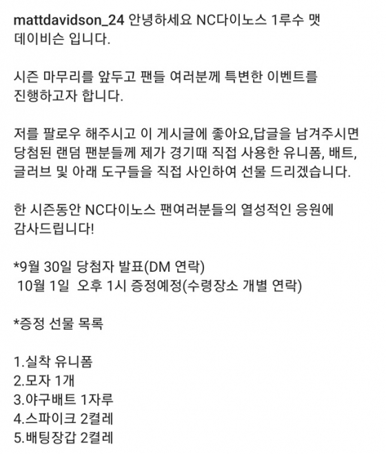 데이비슨은 "저를 팔로우해주시고 이 게시글에 좋아요, 답글을 남겨주시면 당첨된 랜덤 팬분들께 직접 사인하여 선물 드리겠다"고 말했다. 이어 "한 시즌동안 NC 다이노스 팬여러분들의 열성적인 응원에 감사드린다"며 인사를 전했다.