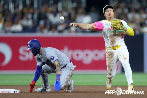 김하성(오른쪽)이 지난 5월 11일(한국시간) LA 다저스와 2024 메이저리그 정규시즌 홈경기에서 더블 플레이를 시도하고 있다. /AFPBBNews=뉴스1