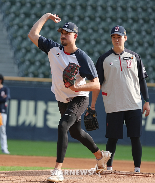 잠실구장에서 훈련을 마치고 취재진과 만난 곽빈은 "연습할 때 이제 날씨도 서늘해지고 실감이 났는데 90%는 재밌을 것 같고 10% 정도는 걱정을 하고 있다. 1차전에 대한 부담이 없지는 않기 때문"이라면서도 "(5위로 나선 지난해보다) 오히려 편하다. (1차전에서 져도) 2차전에 이기면 된다"고 말했다.