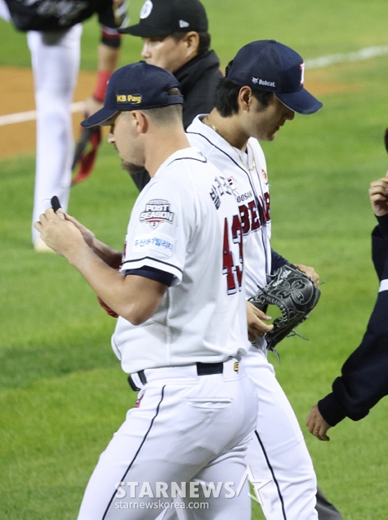 두산 선발 곽빈이 제구 난조로 2회초 발라조빅으로 교체되고 있다.