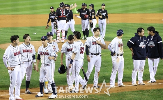 두산에 4-0 완승을 거둔 KT 선수들이 마운드에 모여 기쁨을 나누고 있다. 두산 선수들은 허무한 표정으로 팬들에 인사하고 있다.