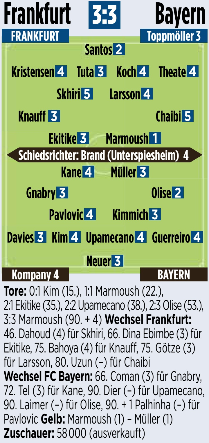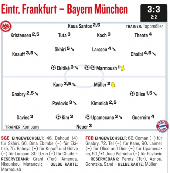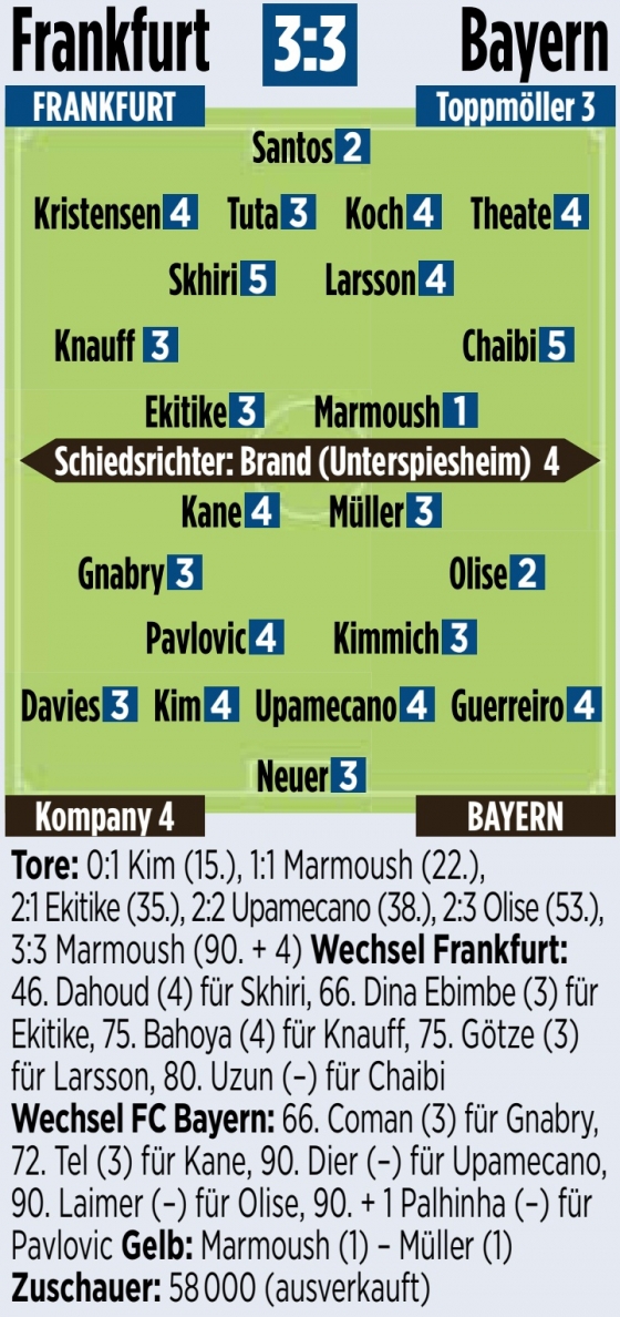 뮌헨은 7일(한국시간) 독일 프랑크푸르트의 도이체 방크 파르크에서 열린 2024~2025 독일 분데스리가 6라운드 아인트라흐트 프랑크푸르트전에서 3-3으로 비겼다.