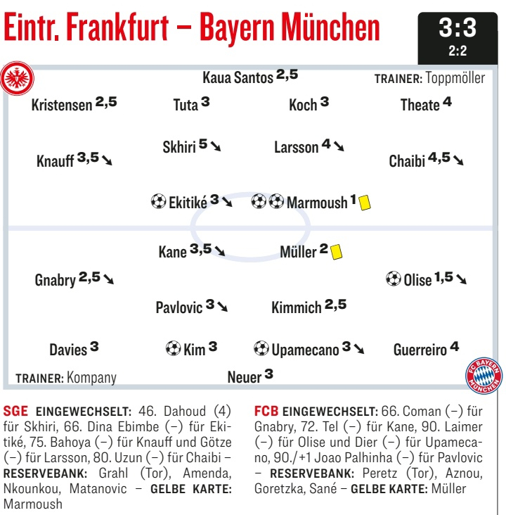 뮌헨은 프랑크푸르트전 세 골을 몰아치고도 3실점하며 승점 1 획득에 그쳤다. 전반 15분 만에 김민재의 골로 앞서나갔지만, 7분 뒤 한 골을 내줬다. 35분에는 우고 에키티케에게 역전골까지 허용했다.