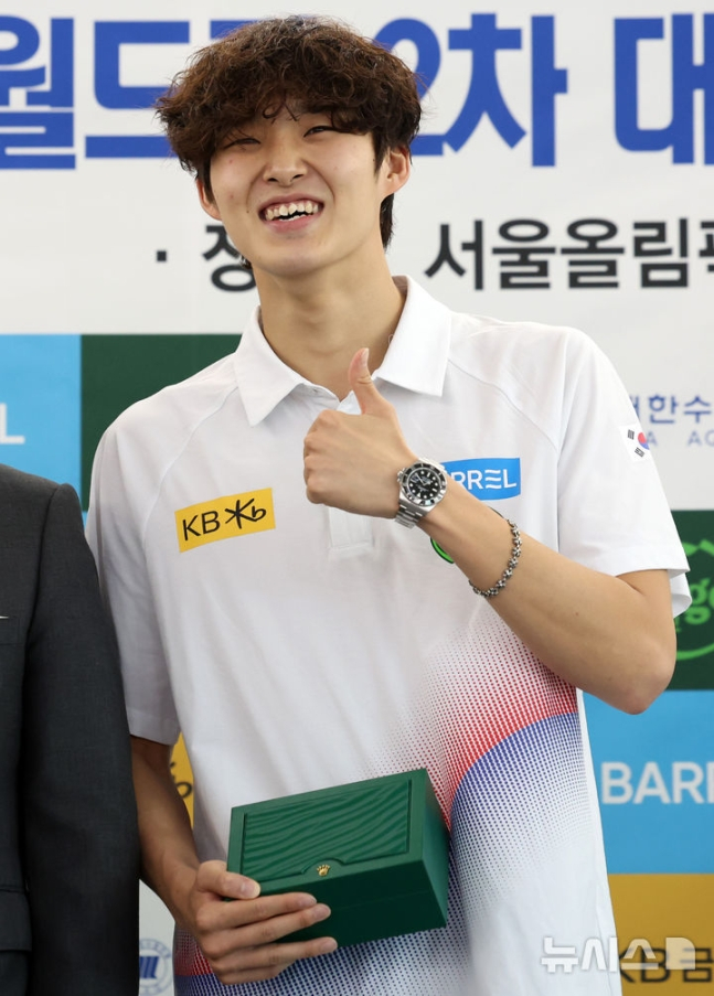 무려 12년 만에 한국 수영에 올림픽 메달을 선물한 김우민(23·강원도청)이 포상금과 명품시계를 받고 활짝 웃었다.
