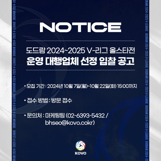 한국배구연맹은 7일 "2025년 1월 4일 개최 예정인 도드람 2024~2025 V-리그 올스타전의 운영 대행업체를 모집한다"고 밝혔다.