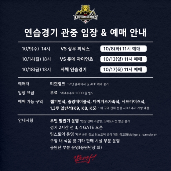 연습경기는 챔피언석, 중앙테이블석, 타이거즈가족석, 서프라이즈석, 1,3루 일반석에 한하여 개방되며, 해당 좌석이 모두 선점될 경우 K3 좌석을 추가로 개방할 계획이다. 외야석과 에코다이나믹스 가족석, 스카이피크닉석, 4층 파티석, 스카이박스는 개방하지 않는다.