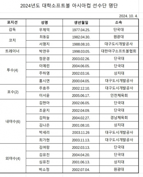 대한야구소프트볼협회(KBSA·회장 이종훈)는 오는 15일부터 19일까지 대만 타이중에서 개최되는 '2024 대학 소프트볼 아시아컵'에 대학 국가대표 선수단을 파견한다고 11일 밝혔다.