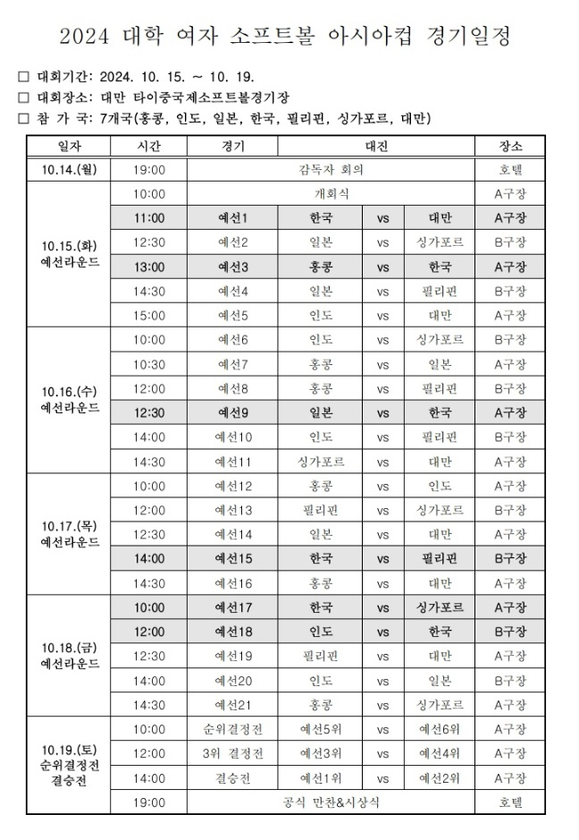 한편 대학 대표팀은 15일 낮 12시(한국시간) 타이중 국제소프트볼구장에서 이번 대회 결승 진출을 위해 가장 중요한 대만과 예선라운드 첫 경기를 치를 예정이다.